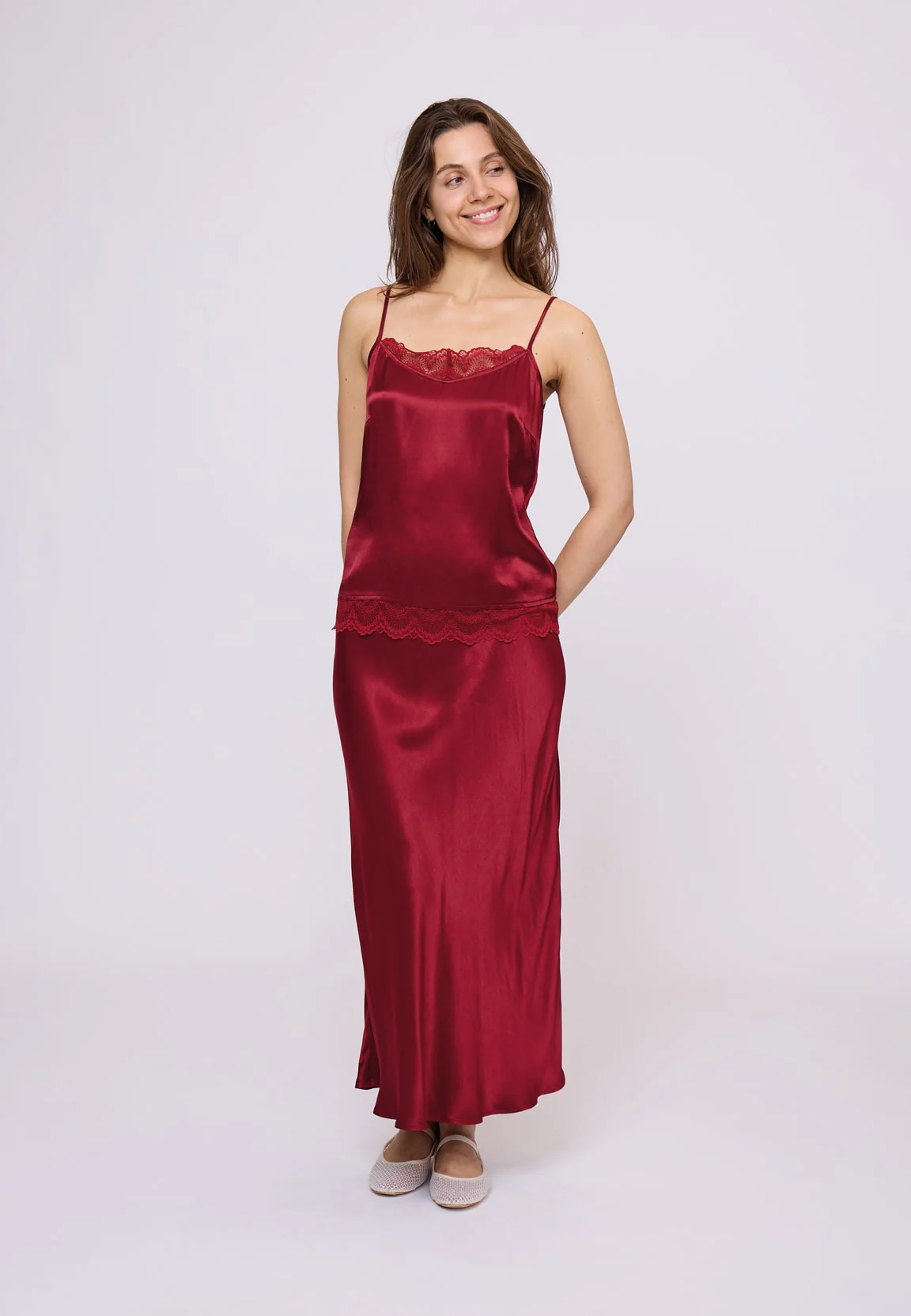 A soft satin top with romantic lace touches. The lace insert at the neckline and trim at the hem add delicate charm.
